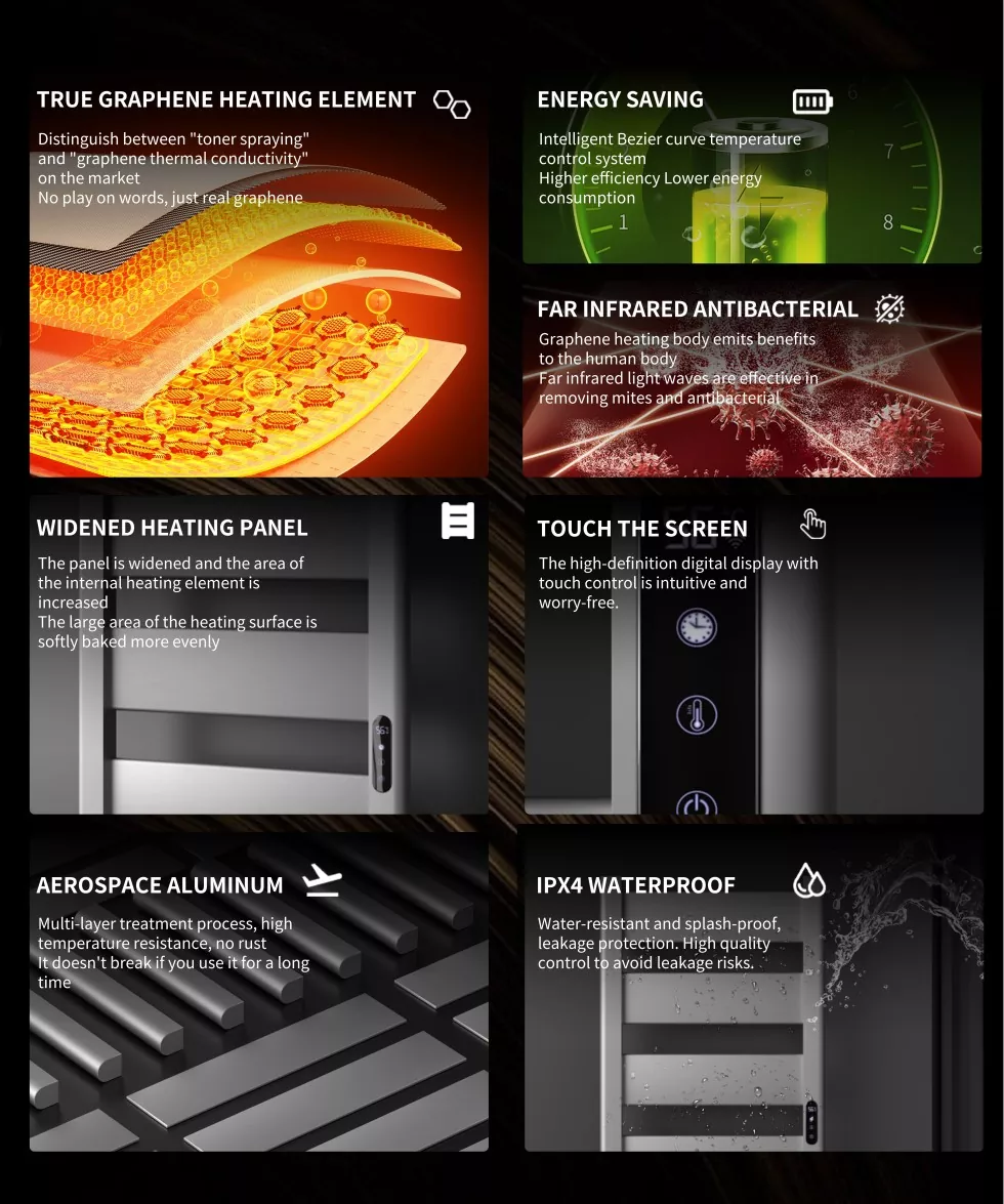 ຜ້າເຊັດໂຕນີ້ແມ່ນມີການປະຕິບັດງານສໍາຜັດ, ໃຊ້ 220V ການສະຫນອງພະລັງງານແລະລະບຽບພະລັງງານທີ່ມີຫຼາຍລະດັບທີ່ມີຄວາມໄວໃນການອົບແຫ້ງ. ລະດັບອຸນຫະພູມແມ່ນ 35-70 ℃, ຊ່ວຍໃຫ້ຜ້າເຊັດໂຕສາມາດອົບອຸ່ນແລະແຫ້ງເປັນເວລາດົນ. ຂະບວນການໃຫ້ຄວາມຮ້ອນແລະການຜຸພັງຮູບເງົາຂອງ Graphene ເພື່ອເສີມຂະຫຍາຍປະສິດທິພາບຂອງຄວາມຮ້ອນແລະຊີວິດ. ການອອກແບບທີ່ມີນ້ໍາຫນັກເບົາທີ່ເຫມາະສົມກັບການອອກແບບເຮືອນຫຼາກຫຼາຍ, ມີສີດໍາແລະສີເງິນທີ່ມີຢູ່, ທັນສະໃຫມແລະສະຫງ່າງາມ. ສ້າງໃນການຄວບຄຸມອຸນຫະພູມທີ່ສົມມຸດ, ກໍານົດເວລາທີ່ກໍານົດເວລາແລະຄວາມຖີ່ຂອງການປະຫຍັດພະລັງງານແລະເປັນມິດກັບພະລັງງານແລະຄວາມຊຸ່ມຊື່ນແລະຄວາມຊຸ່ມຊື່ນຮັບປະກັນຄວາມປອດໄພແລະຄວາມກັງວົນ.